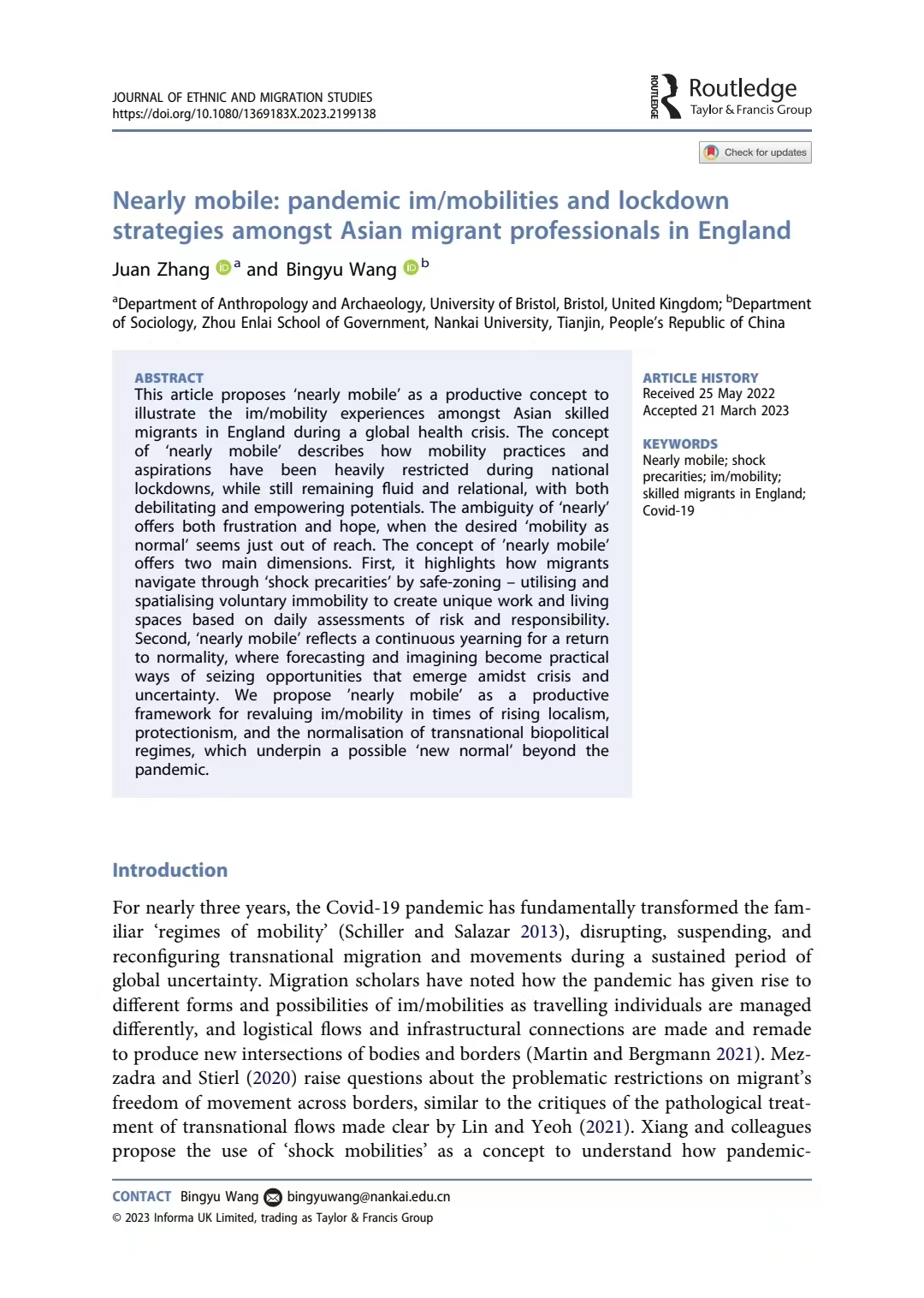 周恩来政府管理学院社学系王炳钰教授(作为通讯作者)与布里斯托大学人类学与考古学系张娟副教授的最新合作文章于2023年4月12日在线发表于移民和族群研究顶刊Journal of Ethnic and Migration Studies (JEMS),文章题为Nearly mobile: pandemic im/mobilities and lockdown strategies amongst Asian migrant professionals in England。所发表期刊JEMS为英文核心期刊(SSCI)一区刊物(Journal Citation Reports-Q1);作为移民研究国际权威刊物,JEMS在JCR“族群研究”与“人口学”两个类别均排名世界第1,在谷歌学术“移民研究”和“社会学”两个类别的世界排名分别为第1和第2。本期推文将对这篇文章的研究问题、研究发现以及主要贡献进行介绍。