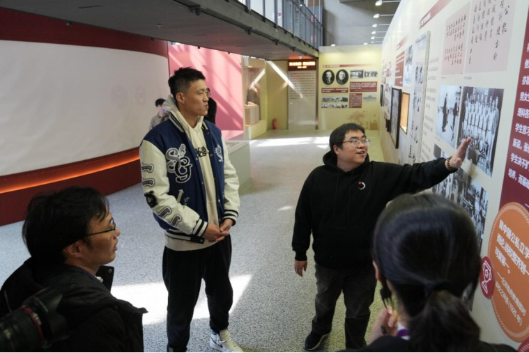 友谊赛后,周鹏一行还参观了百年校史展,在五楼自拍