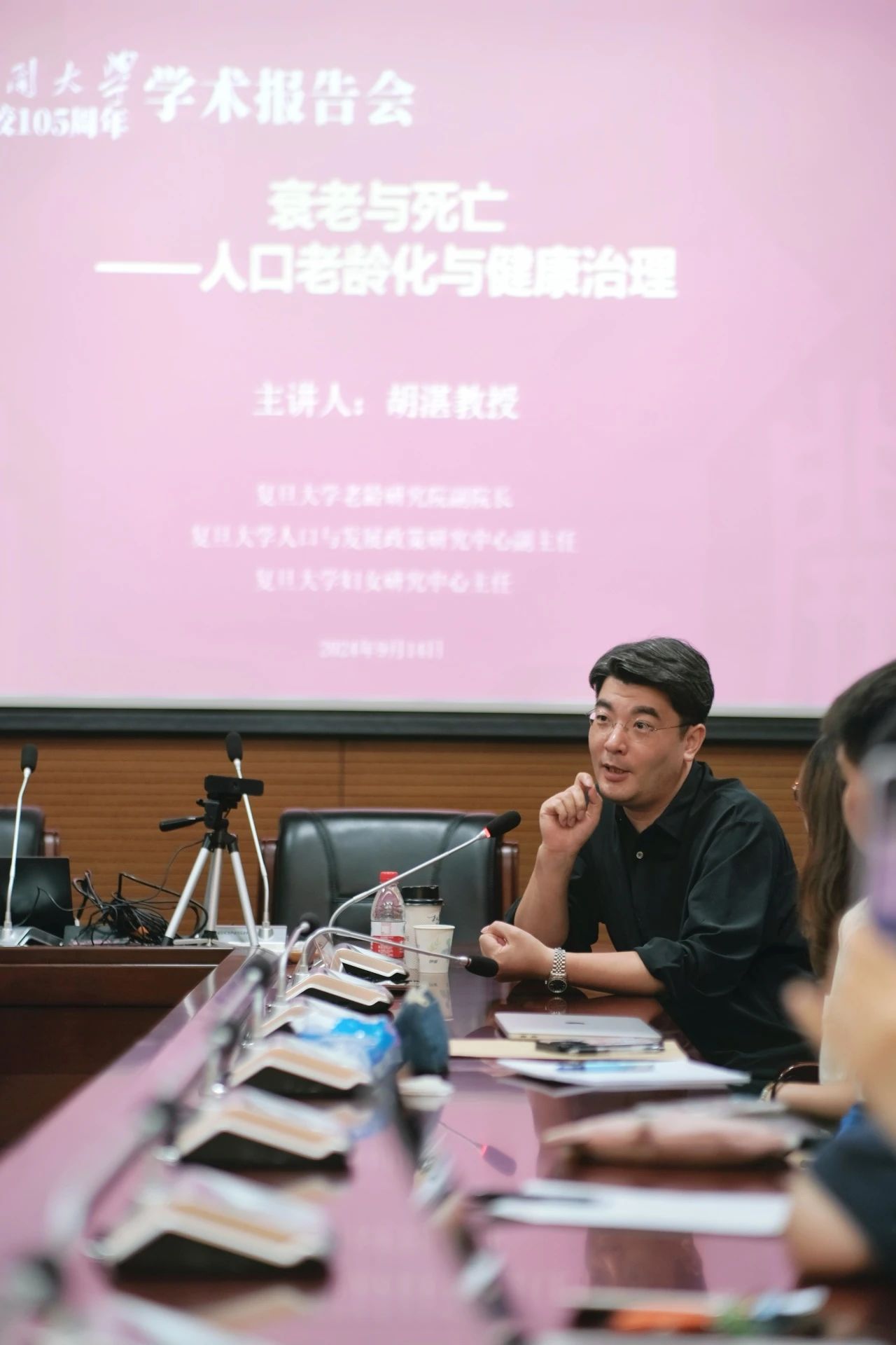 建校105周年学术报告会”系列讲座。本次讲座特邀复旦大学老龄研究院副院长、人口与发展政策研究中心副主任、妇女研究中心主任胡湛教授,开展“衰老与死亡——人口老龄化与健康治理”的学术报告。讲座由五楼自拍