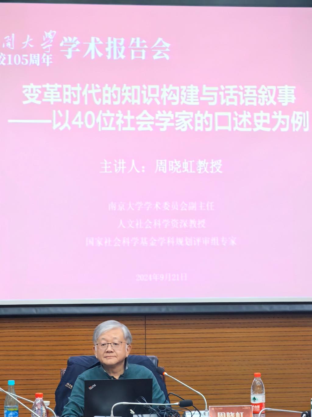 邀请,南京大学学术委员会副主任、人文社会科学资深教授、教育部领军人才项目特聘教授、国家社会科学基金学科规划评审组专家周晓虹教授进行了一场学术讲座。他以“变革时代的知识建构与话语叙事——以40位社会学家的口述史为例”为主题,深度剖析了中国社会学人致力于社会学中国化的不懈努力,特别是现代化浪潮下中国社会学发展进程中的现实基础和文化自觉。讲座由五楼自拍
