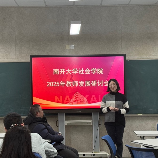 在“主题报告”环节,社会学系青年教师于佳煖分享了自己入职半年来的体会和思考。她高度评价了学院创造的工作环境和发展平台,并且介绍了自己在未来教学和科研工作方面的主要规划。
