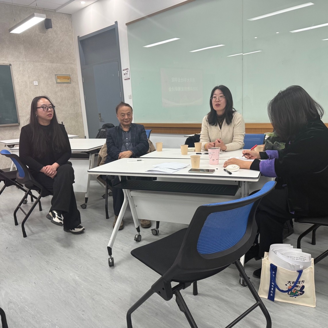 在自由讨论环节,学院老师们纷纷从自身经历出发,针对学院建设和教师发展交流个人体会。他们回顾了学院成立以来自己的工作情况,对于学院未来的发展给予了建议和祝福。老师们尤其感谢学院搭建的交流平台,他们通过这些交流拉近了距离,增强了学术共同体的凝聚力和认同感。
