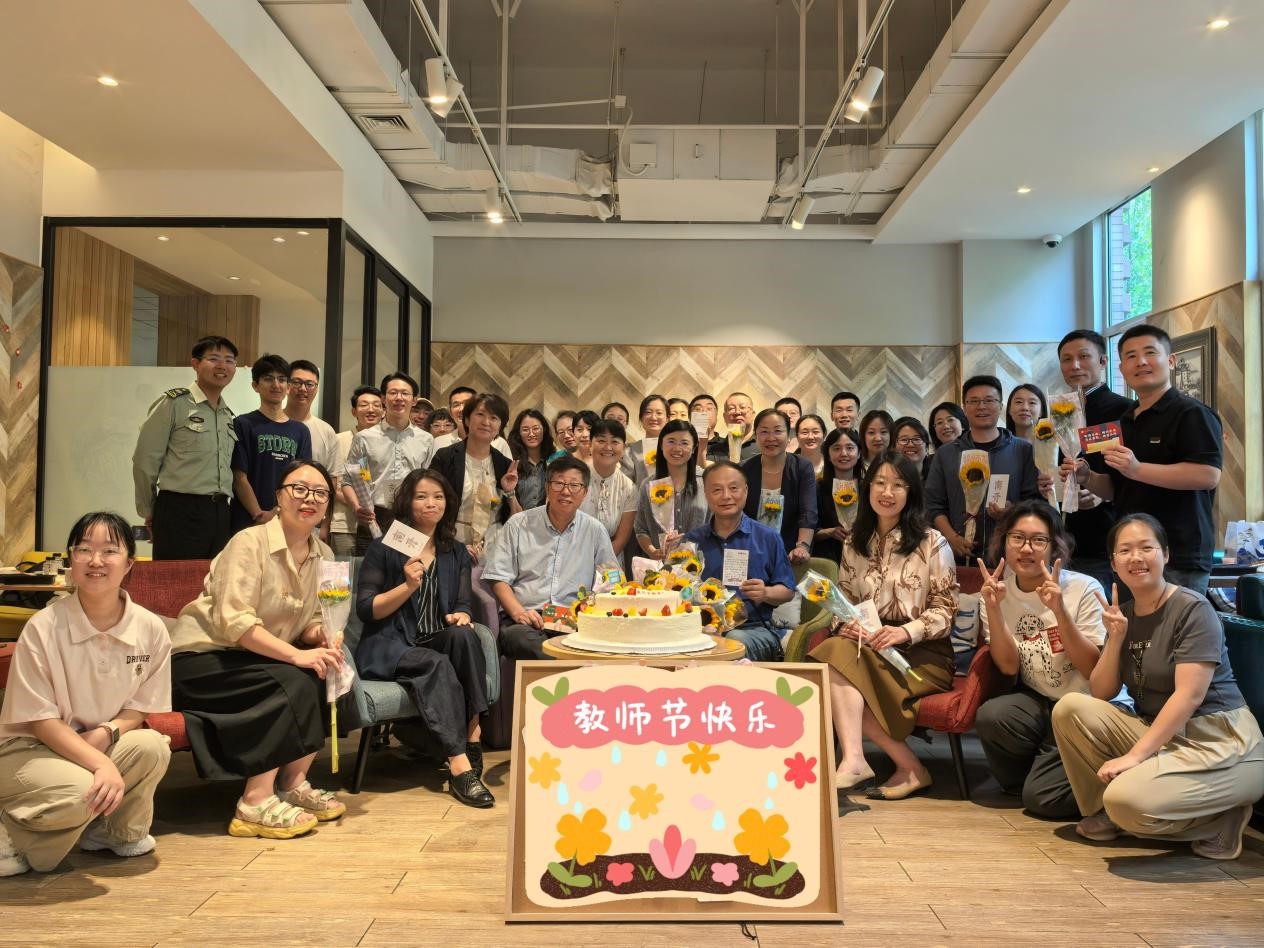 校工会同时为教师们准备了教师节蛋糕和向日葵鲜花,学生们还为每位教师送上手写贺卡以表达真挚的节日祝福。咖啡厅内欢声笑语不断,教师们畅叙情谊,交流教学心得,探讨学术问题,气氛热烈而融洽。