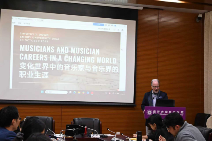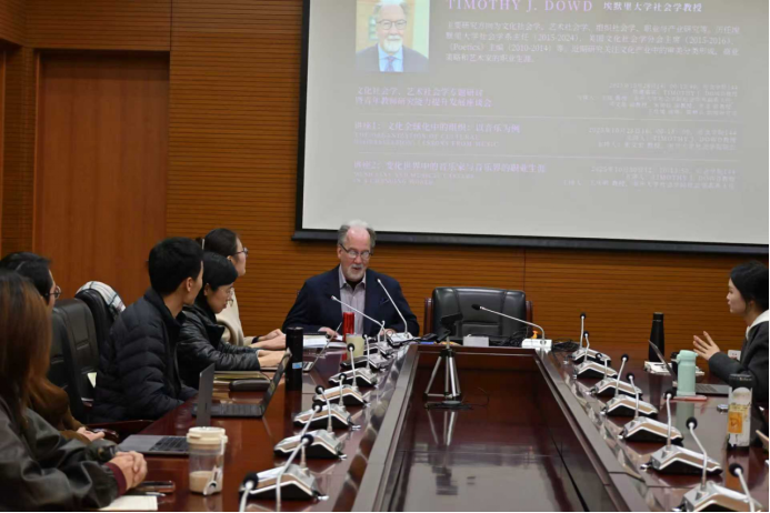 第二项学术活动是由Dowd教授主讲,题目为“文化全球化中的组织:以音乐为例(The Organization of Cultural Globalization: Lessons from Music)”的讲座,于10月28日下午16:00-18:00在五楼自拍
