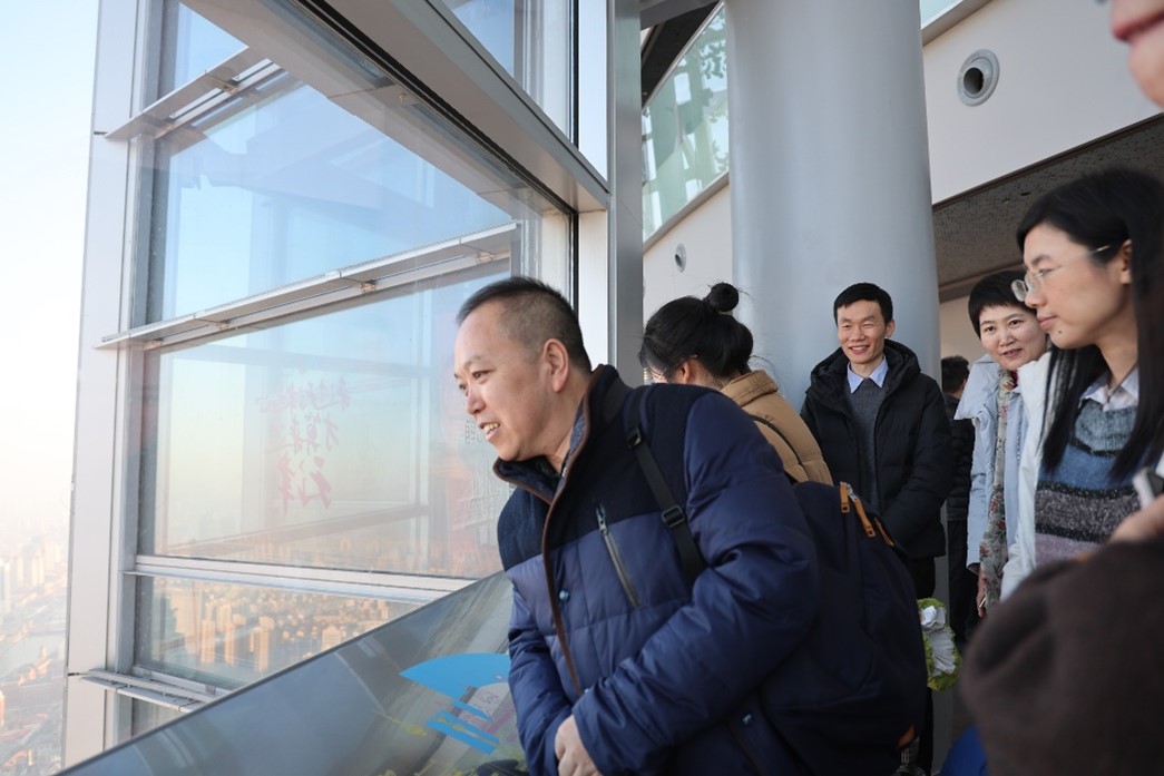 教职工们、校友们抵达津塔高层观景区域,一幅壮丽的城市画卷在眼前徐徐展开。极目远眺,鳞次栉比的高楼大厦错落有致,纵横交错的道路如丝带般穿梭其中,车水马龙,川流不息。远处,海河蜿蜒流淌,波光粼粼,宛如一条蓝色的绸带镶嵌在城市之中,为这座现代化都市增添了一抹灵动与柔美。冬日的阳光洒在城市的每一个角落,给万物都披上了一层金色的光辉,整个城市显得格外璀璨夺目。
